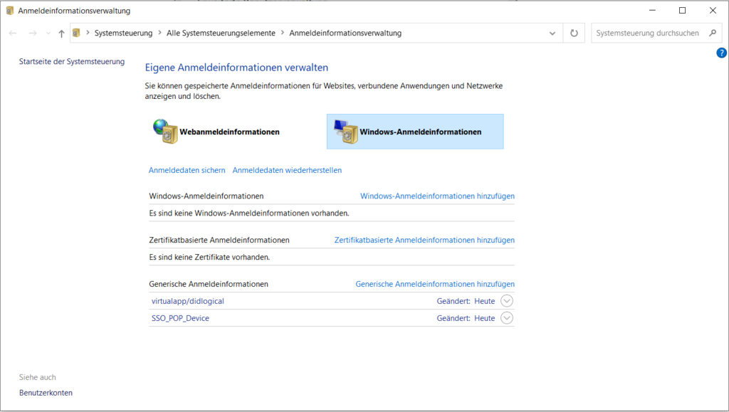 Ein weiterer Klick auf den Punkt Kennwörter verwalten öffnet die Anmeldeinformationsverwaltung.