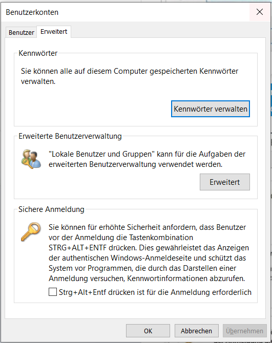Es öffnet sich das Fenster mit der Benutzerkonten-Steuerung. Hier wechselt man nun gleich auf den Punkt „Erweitert“. (oben in der Registerkarte)